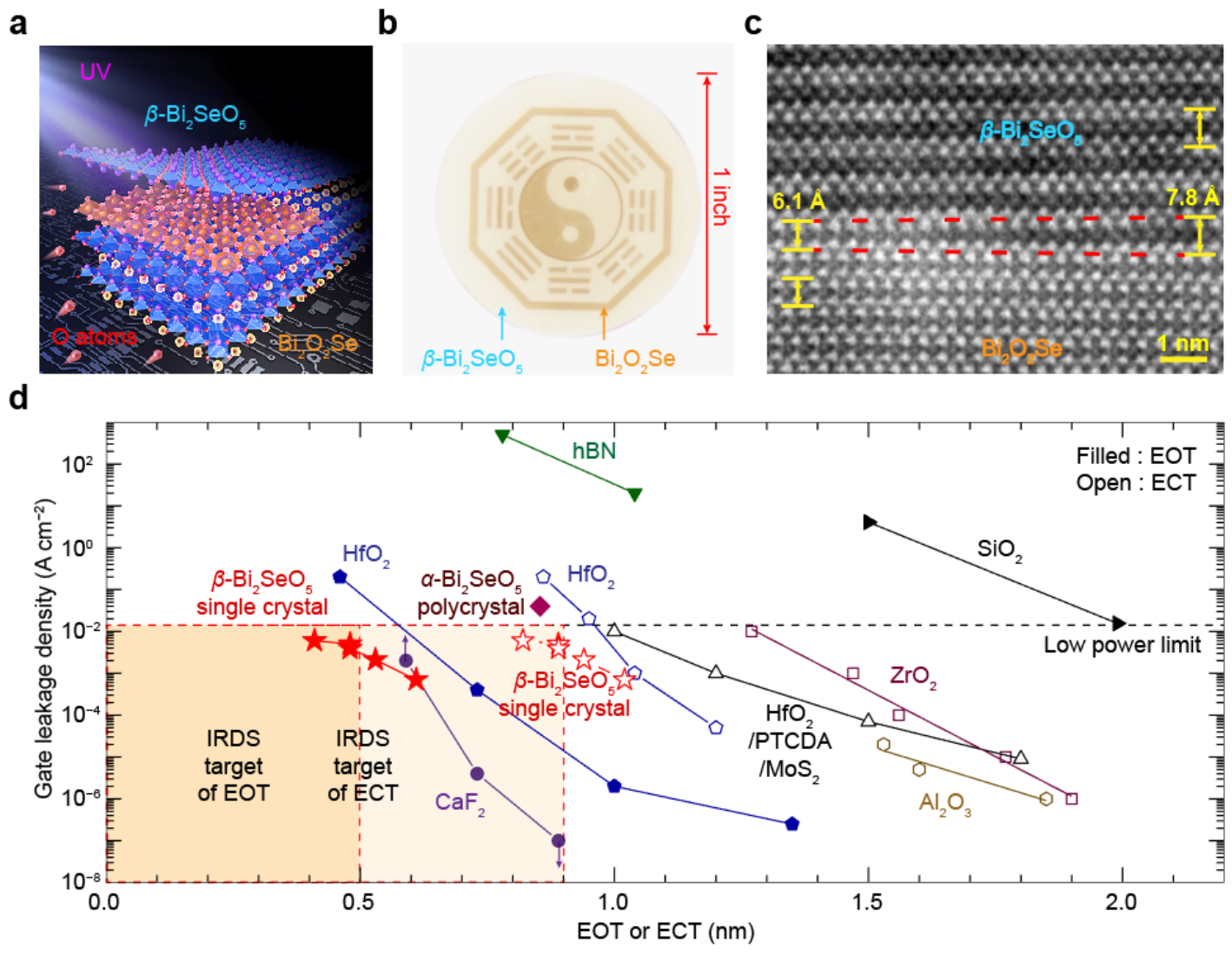 圖1.單晶自然氧化物柵介質β-Bi2SeO5的制備與性質。(a)二維Bi2O2Se紫外光輔助插層氧化轉化為單晶柵介質β-Bi2SeO5示意圖;(b)晶圓級區(qū)域選擇性制備二維Bi2O2Se / Bi2SeO5異質結;(c)二維Bi2O2Se /Bi2SeO5異質結界面結構;(d)β-Bi2SeO5的等效厚度(EOT:等效氧化層厚度;ECT:等效電容厚度)及絕緣性與其他柵介質的對比。